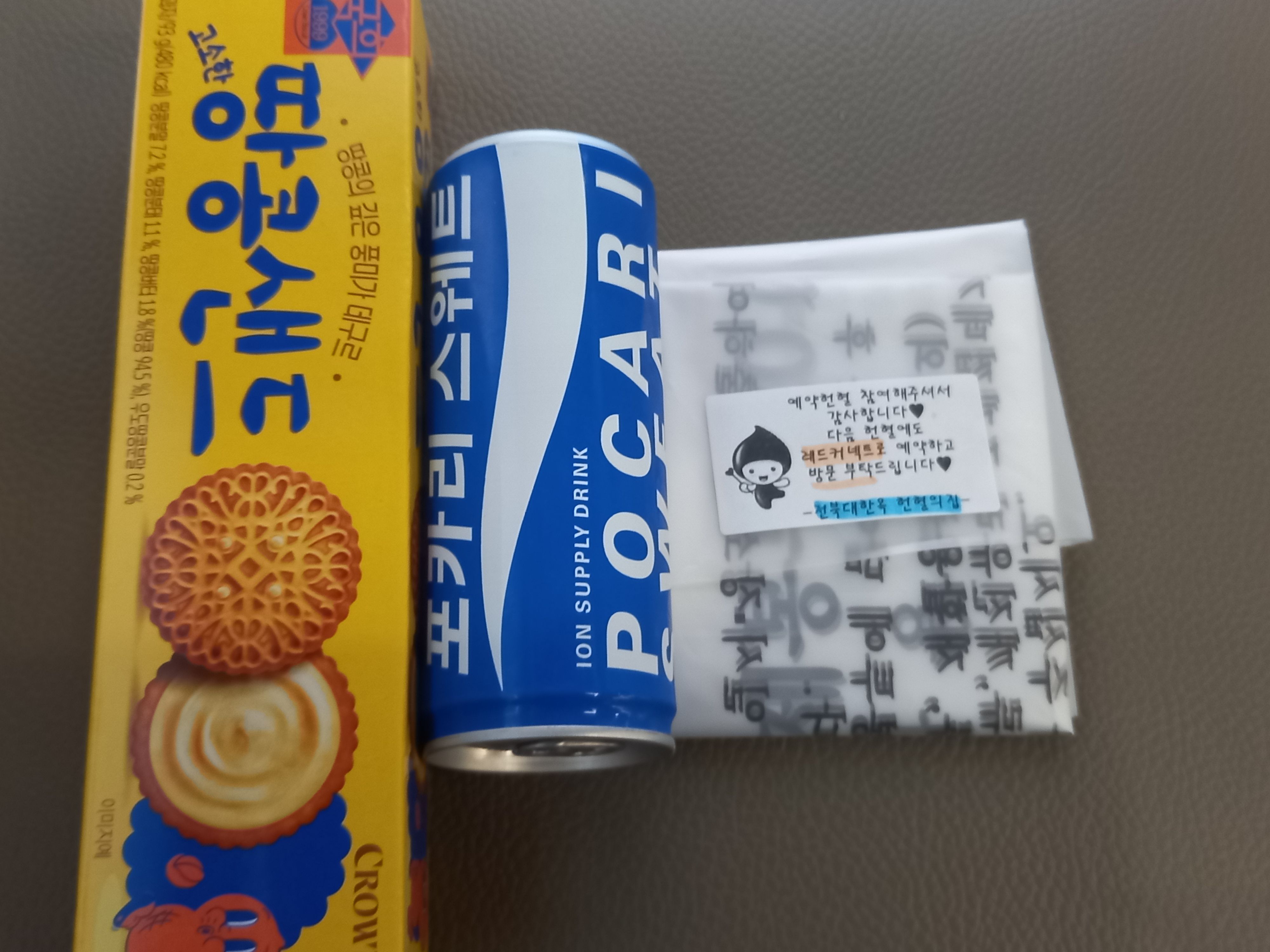 포카리스웨트는 냉장고, 과자는 정수기 위에 놓여 있었는데 하나씩 가져갈 수 있었습니다. 또 레드커넥트 예약 헌혈 기념으로 쓰레기 종량제 봉투를 받았습니다. 문제는 여행이 끝나고 집에 돌아가서 확인해보니 전주시에서만 쓸 수 있는 거라 저에게는 계륵이었습니다.