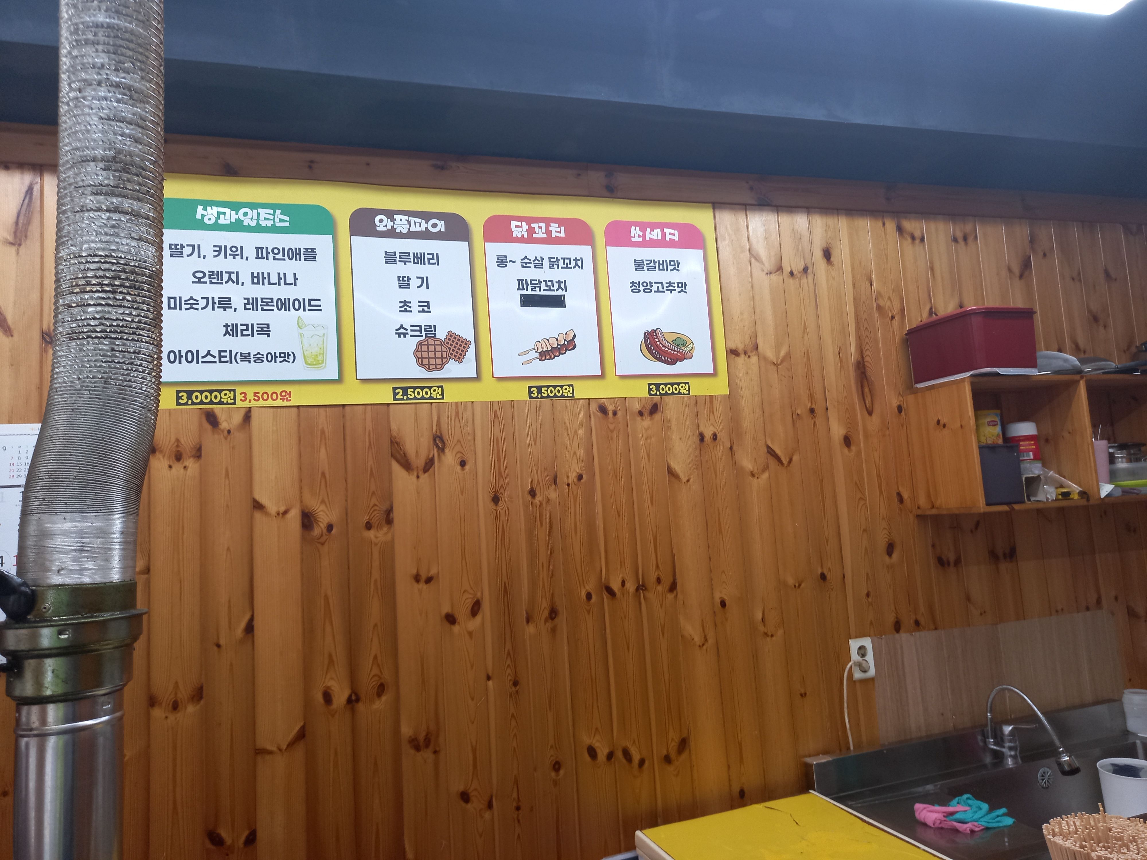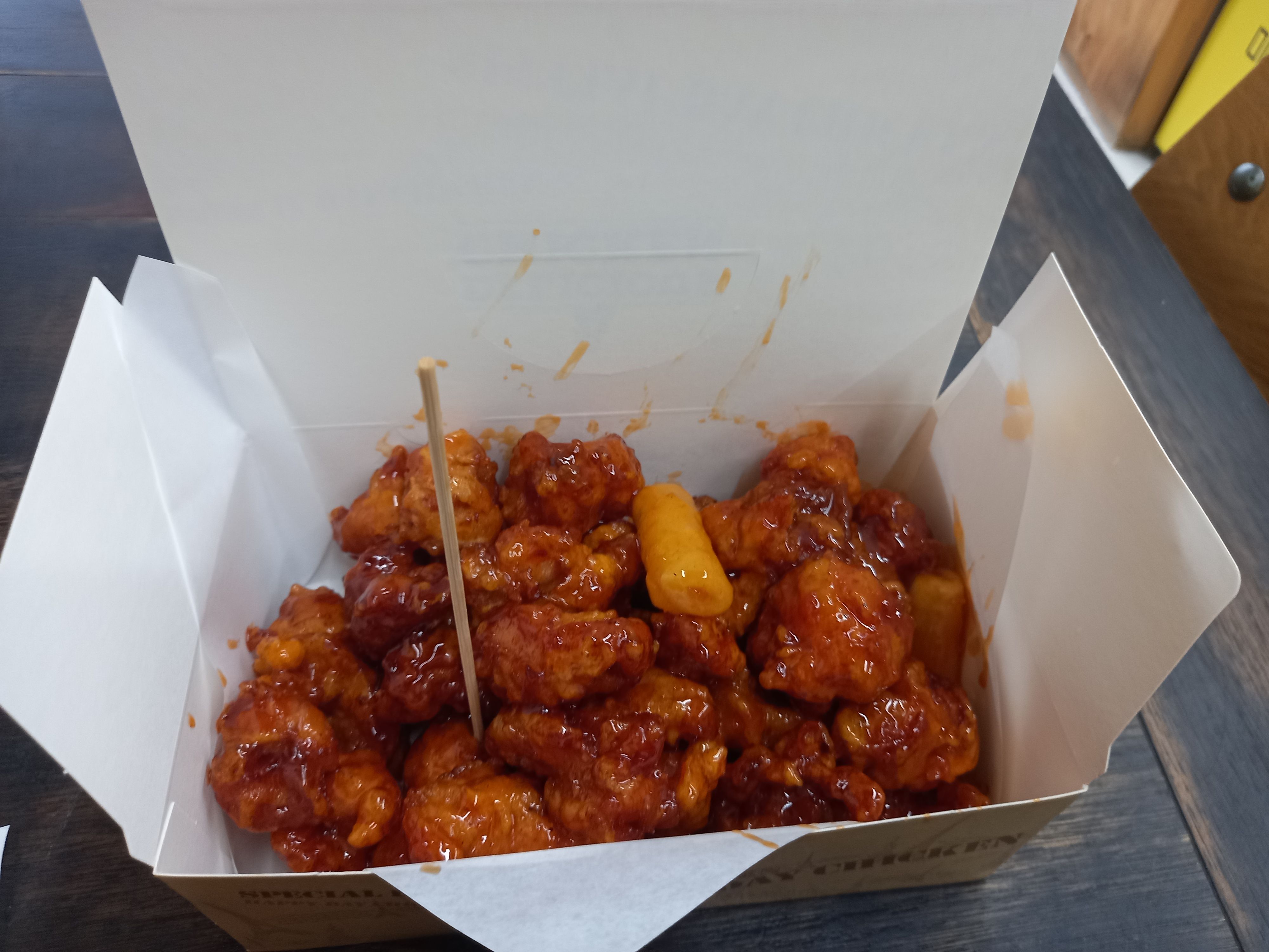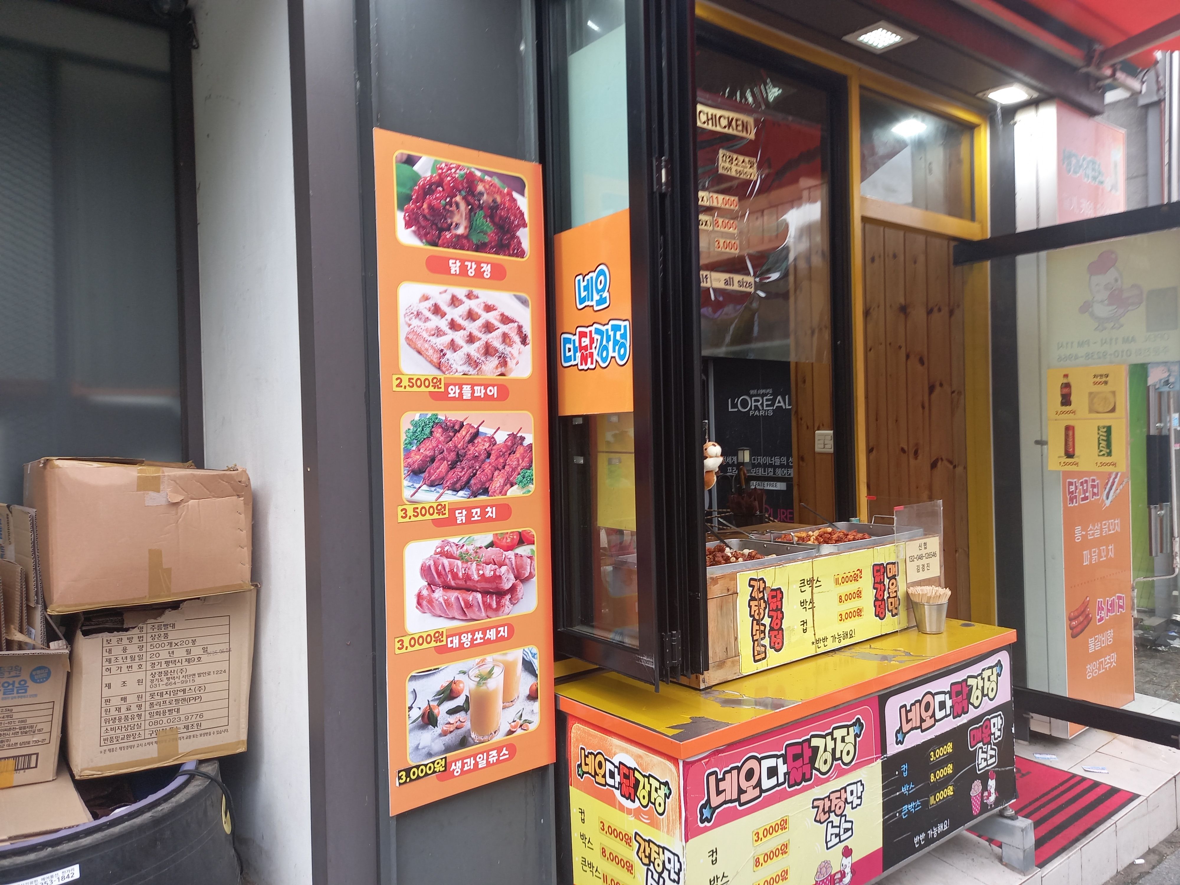 점심을 뭐로 먹을까 대학교 앞을 둘러보니 닭강정이 눈에 띄었습니다. 평소에 좋아하는 음식이라 들어갔습니다. '즐거운네오다다'라는 문구점 건물에 닭강정, 와플, 닭꼬치, 소시지 등을 판매하는 작은 음식점이었습니다. 나중에 영수증을 확인해보니 '컵피자'라는 상호명이었습니다. 아무튼 11,000원짜리 닭강정을 주문했습니다. 안에서 식사해도 되냐고 물어보니 그렇다고 대답을 들었습니다.