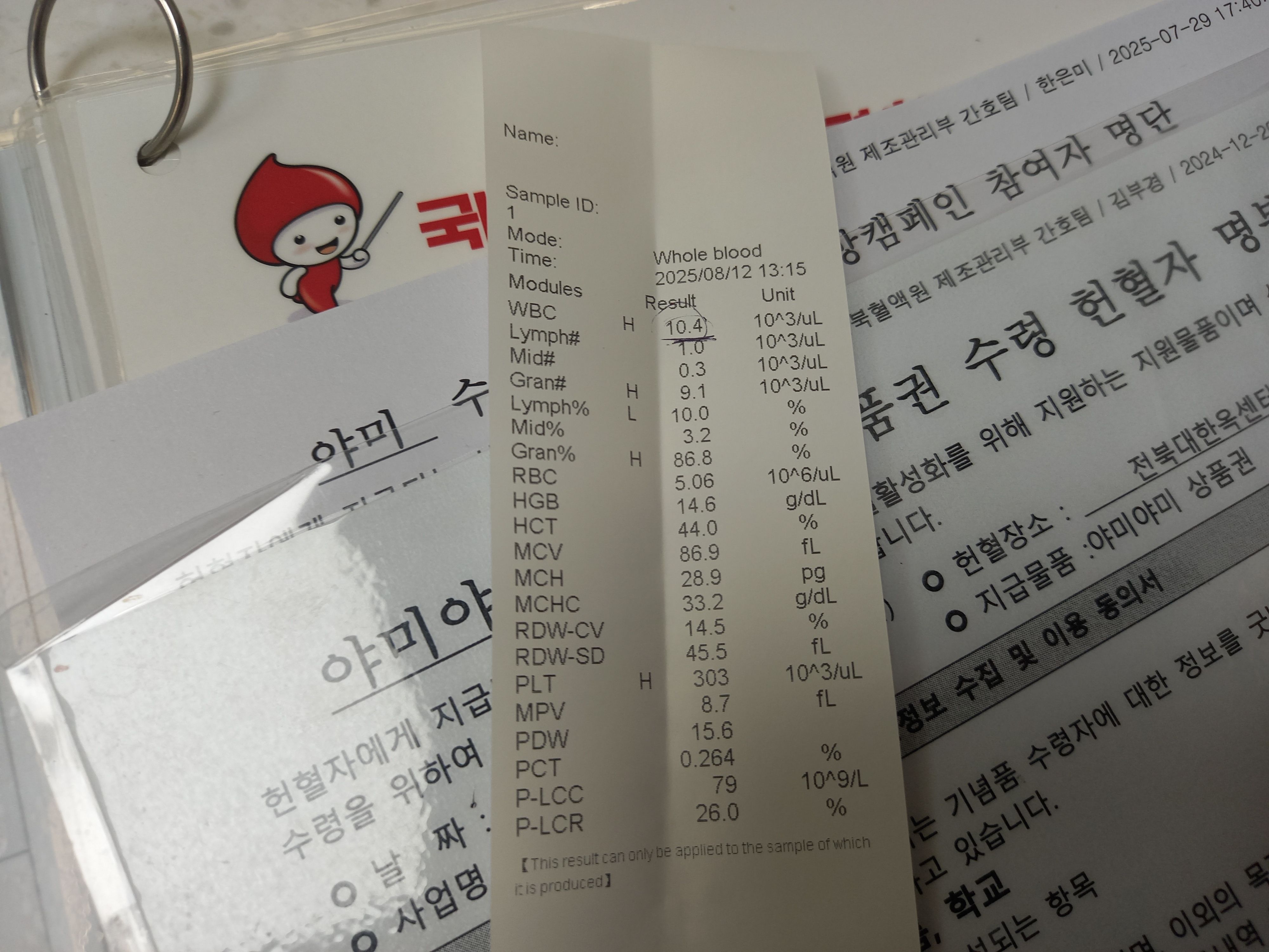 참고로 백혈구 수치에 대해 물어보니 전혈헌혈이나 혈장헌혈은 백혈구 수치가 아주 높게 나와도 제한이 없다고 합니다. 물론 백혈병이 의심되는 정도의 수치가 나온다면 얘기가 달라지겠지만요.
