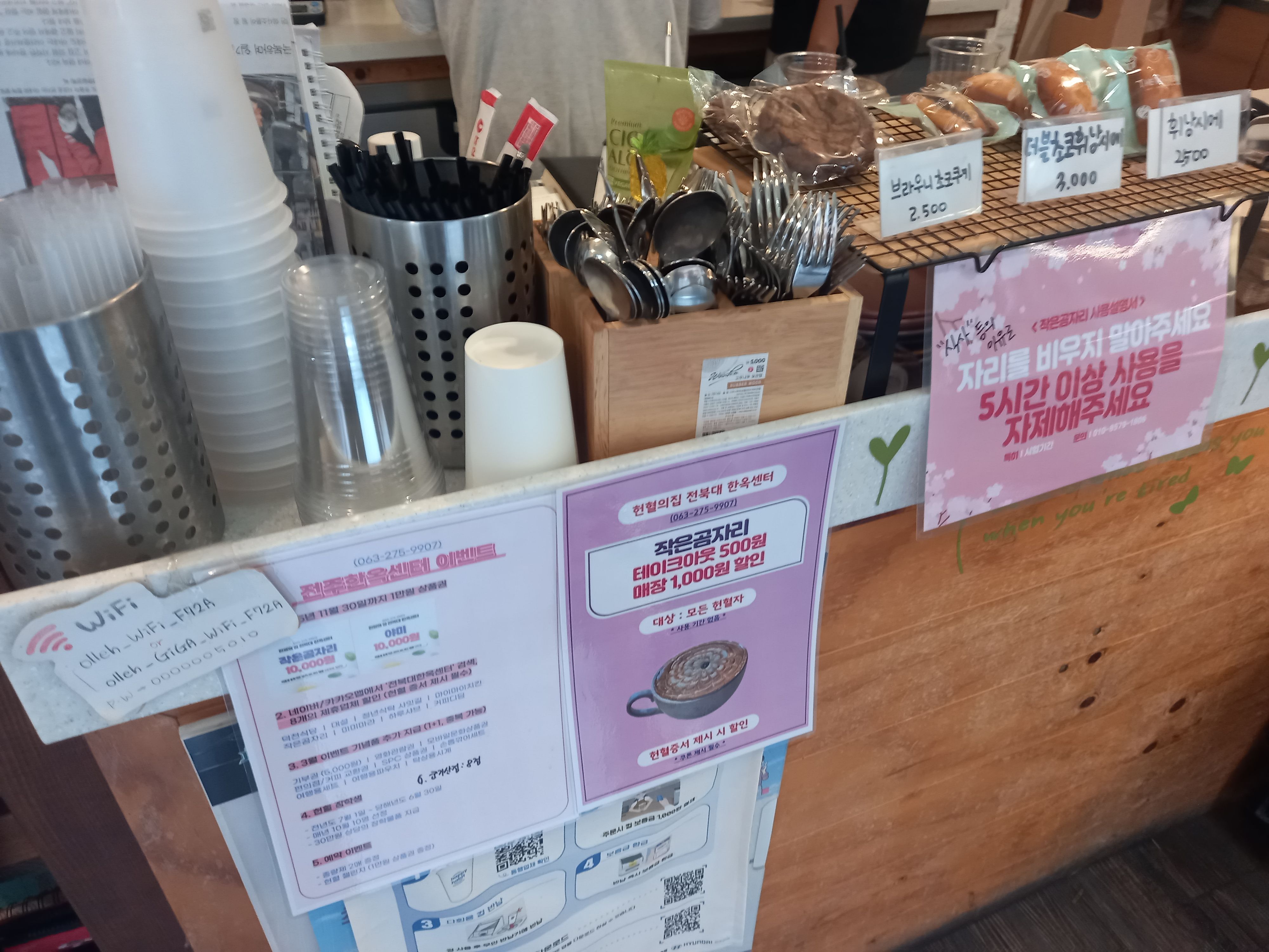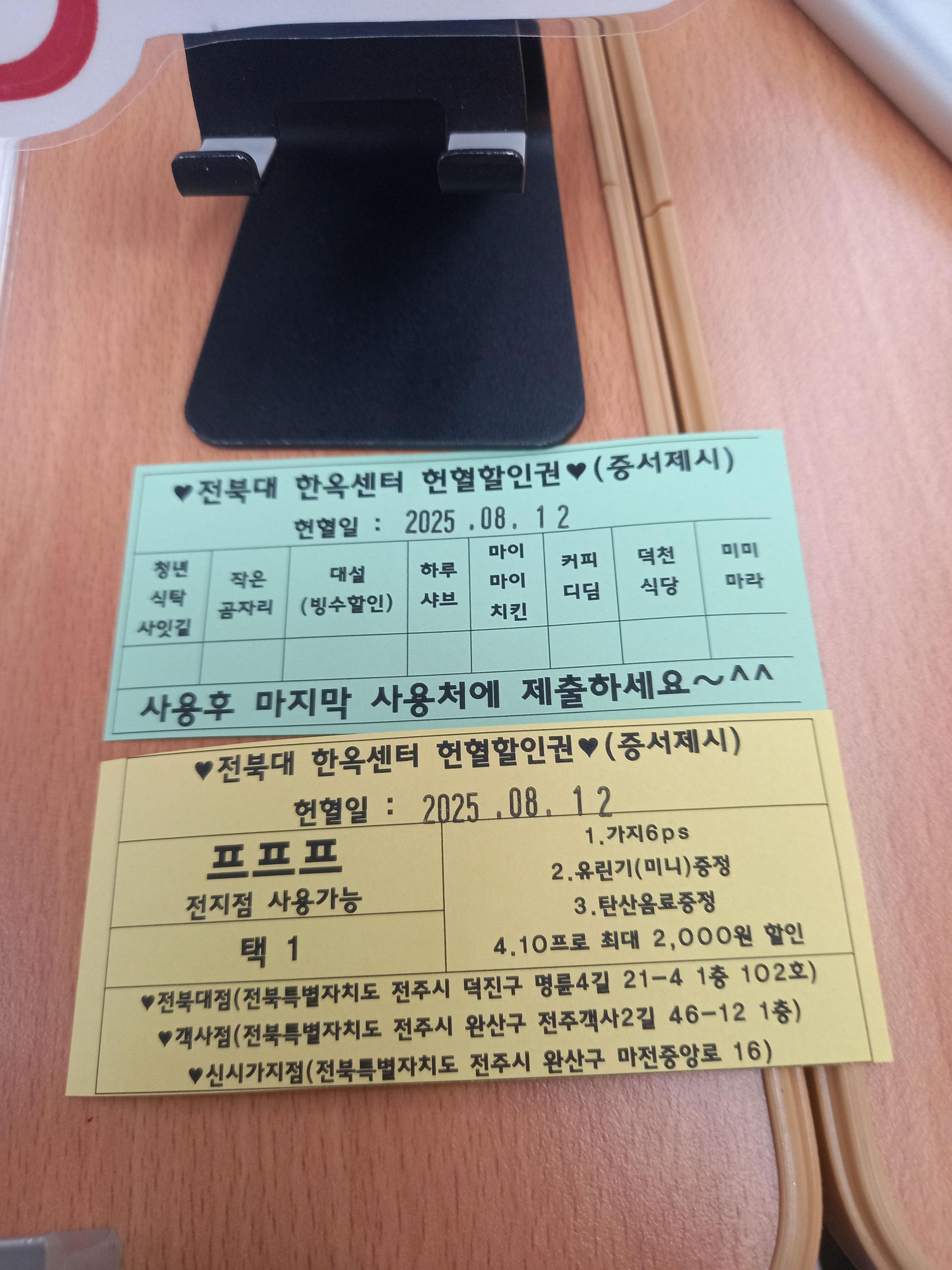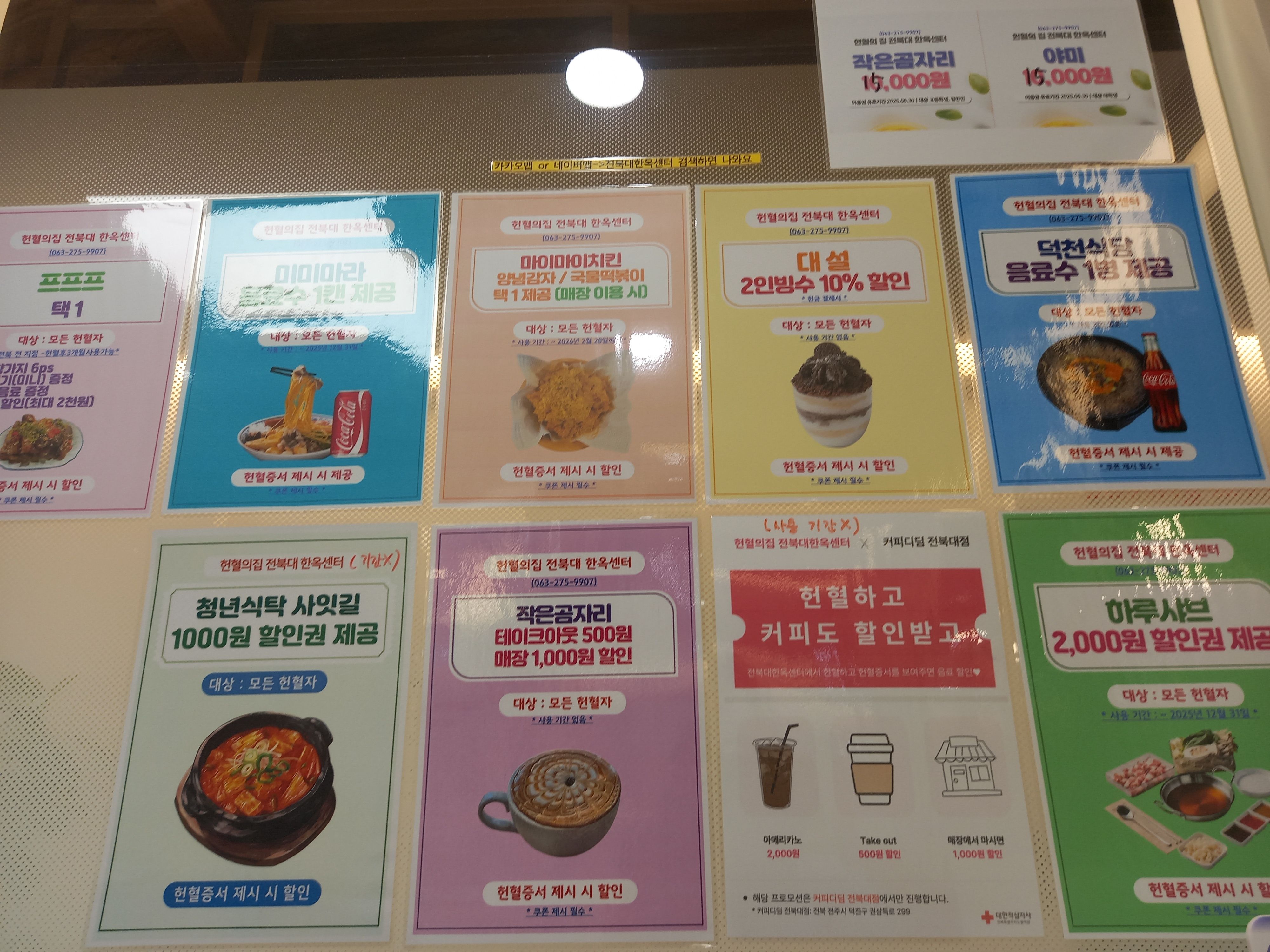 경황이 없어서 사진을 찍지 못했는데 헌혈증서는 당연히 챙겼습니다. 또 롯데시네마 영화관람권과 5,000원 짜리 문화기프트 교환권도 받았습니다. 혈장헌혈 1+1 행사 진행 중인게 내심 다행이었습니다. 또 '작은곰자리'라는 전주의 한 카페에서 쓸 수 있는 10,000원짜리 교환권 하나, 5,000원짜리 교환권 하나도 받았고요. 아무튼 헌혈을 마치고 식사를 하러 갔습니다.