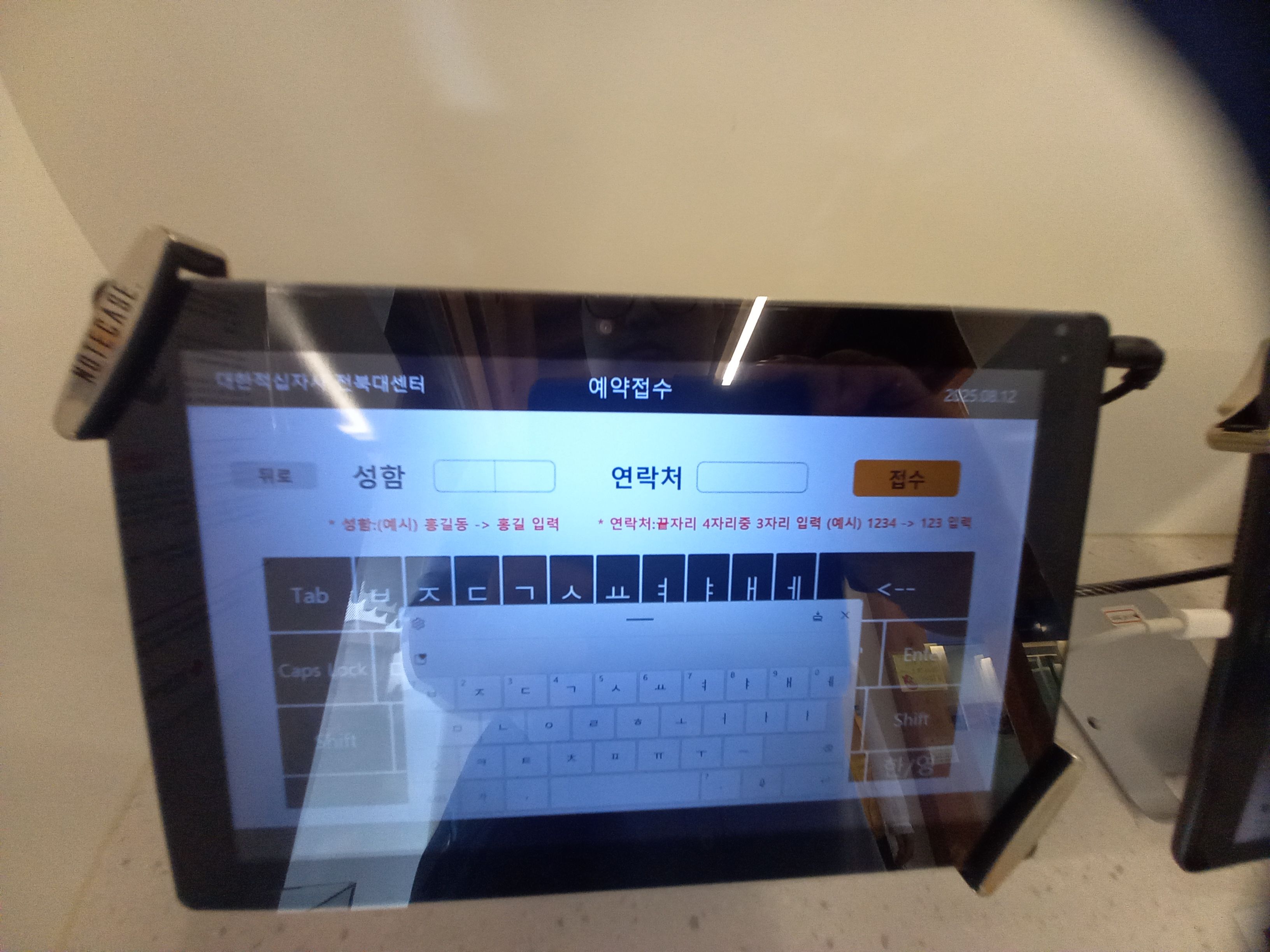 전북대한옥센터는 평일 오전 9시 ~ 오후 6시에만 운영합니다. 주소는 '전라북도 전주시 덕진구 백제대로 567'이고요. 2023년 12월 26일에 개소한 헌혈의집입니다. 그래서인지 내부 시설이 최신식이었습니다. 번호표 대신에 접수용 태블릿 PC에서 헌혈자 접수를 받습니다. 이름과 전화번호를 입력하면 접수가 되고, 문진실에서 불러줍니다.
