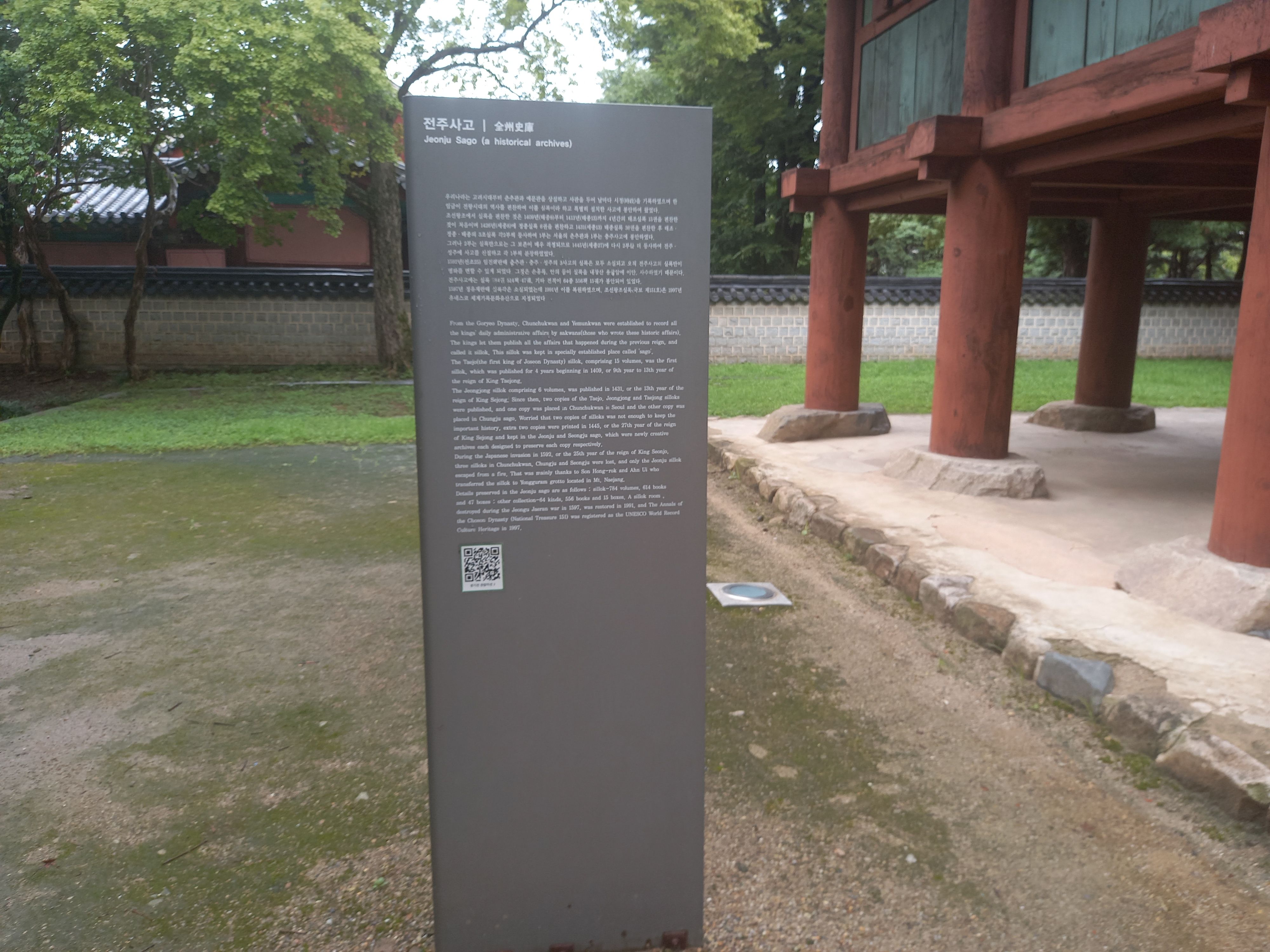 '전주사고' 실록각 건물을 봤습니다. 이 곳은 조선왕조실록이 보관되어 있던 장소로, 원래 건물은 임진왜란 시기 파괴되었습니다. 1991년에 4세기 만에 건물이 전시관 형태의 실록각으로 복원되었습니다. 실록각 내부에 실록의 편찬방법, 전주사고 소개 전시관이 있는데, 사진을 찍는다는 걸 깜빡 잊어버렸습니다. 다음에는 이런 일이 없도록 해야겠습니다.