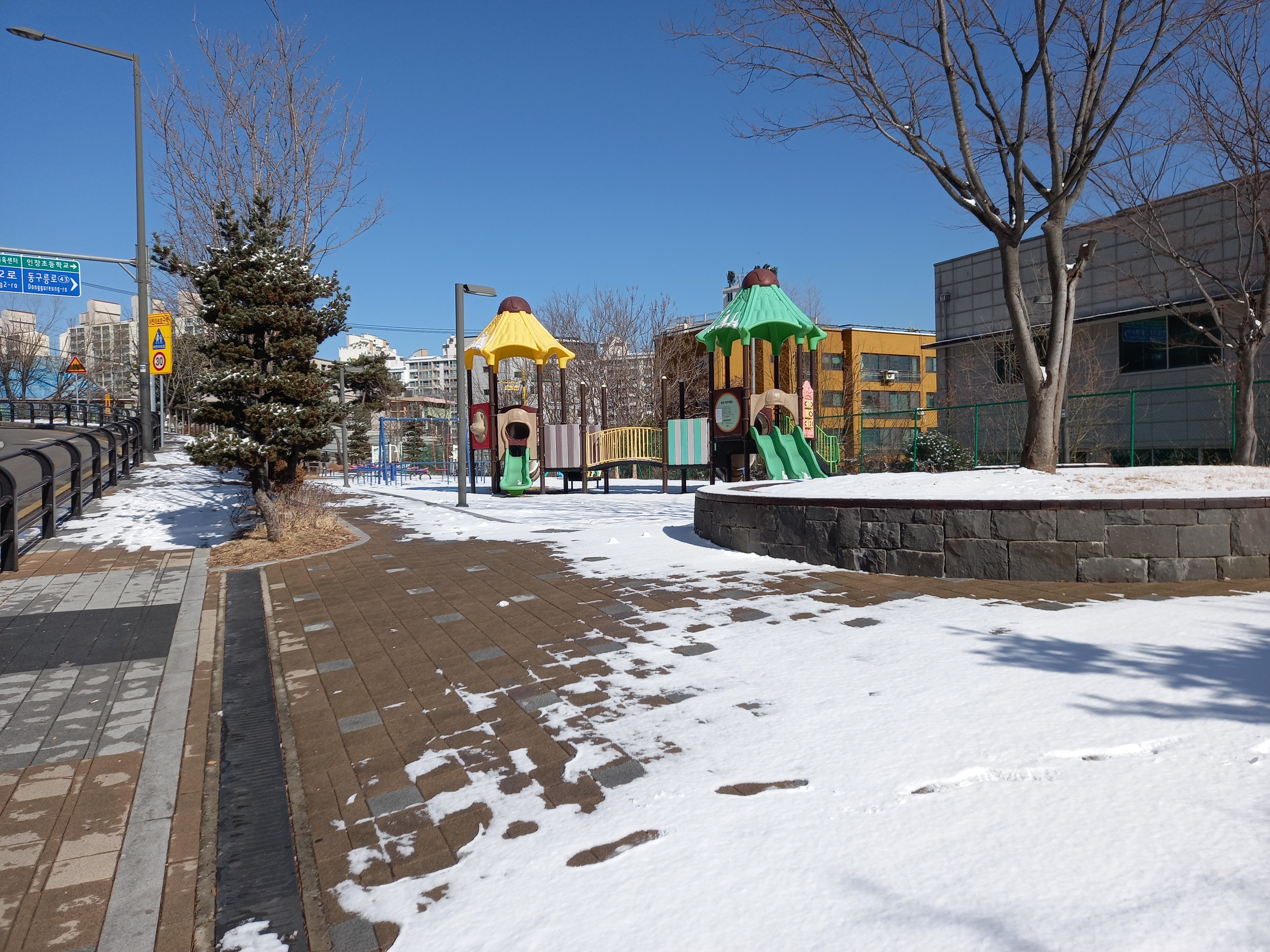 날씨가 점점 따뜻해지는데 몇 달 전 한 공원에서 눈이 왔을 때 찍은 사진을 올려봅니다. 카카오 지도 사이트에는 '포스코아파트공원'으로 나와 있지만 네이버 지도 상으로는 공원 이름이 안 나옵니다. 현장에 가면 '포스코어린이놀이터'라고 표시되어 있네요.