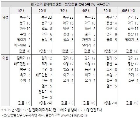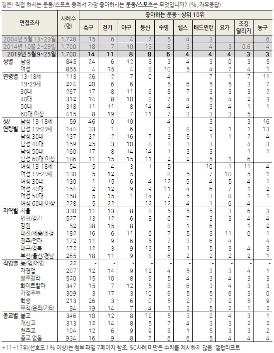 가장 최신인 올해 조사에서는 6위부터는 농구 4.0%, 배드민턴 3.5%, 걷기 3.1%, 조깅 및 달리기 2.8%, 테니스 2.1%, 요가 1.9%, 사이클·탁구 1.6%으로 나타났습니다.