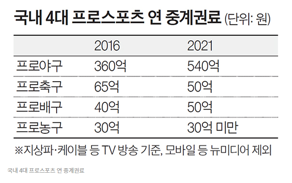 국내 4대 프로스포츠인 프로야구·프로축구·프로배구·프로농구 중계권 계약이 2019년부터 올해에 걸쳐 갱신됐다. ◆‘부익부’ 프로야구·프로배구 =KBO는 지난해 2월 지상파 3사(KBS·MBC·SBS)와 KBO