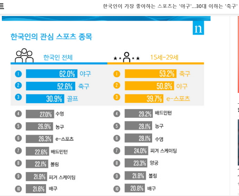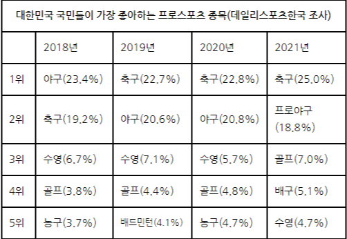 * 뜬금없지만 2021년 12월 말일의 글은 뭔가 전체적인 스포츠글을 쓰고 싶어졌네요. 그래서 단순 주위 체감이 아니라 제대로 알아보기 위해 우리나라 스포츠 종목 인기에 대해 알아봤습니다. 각종 여론조사 기관에서의 스포츠 종목 선호도가 기준입니다.