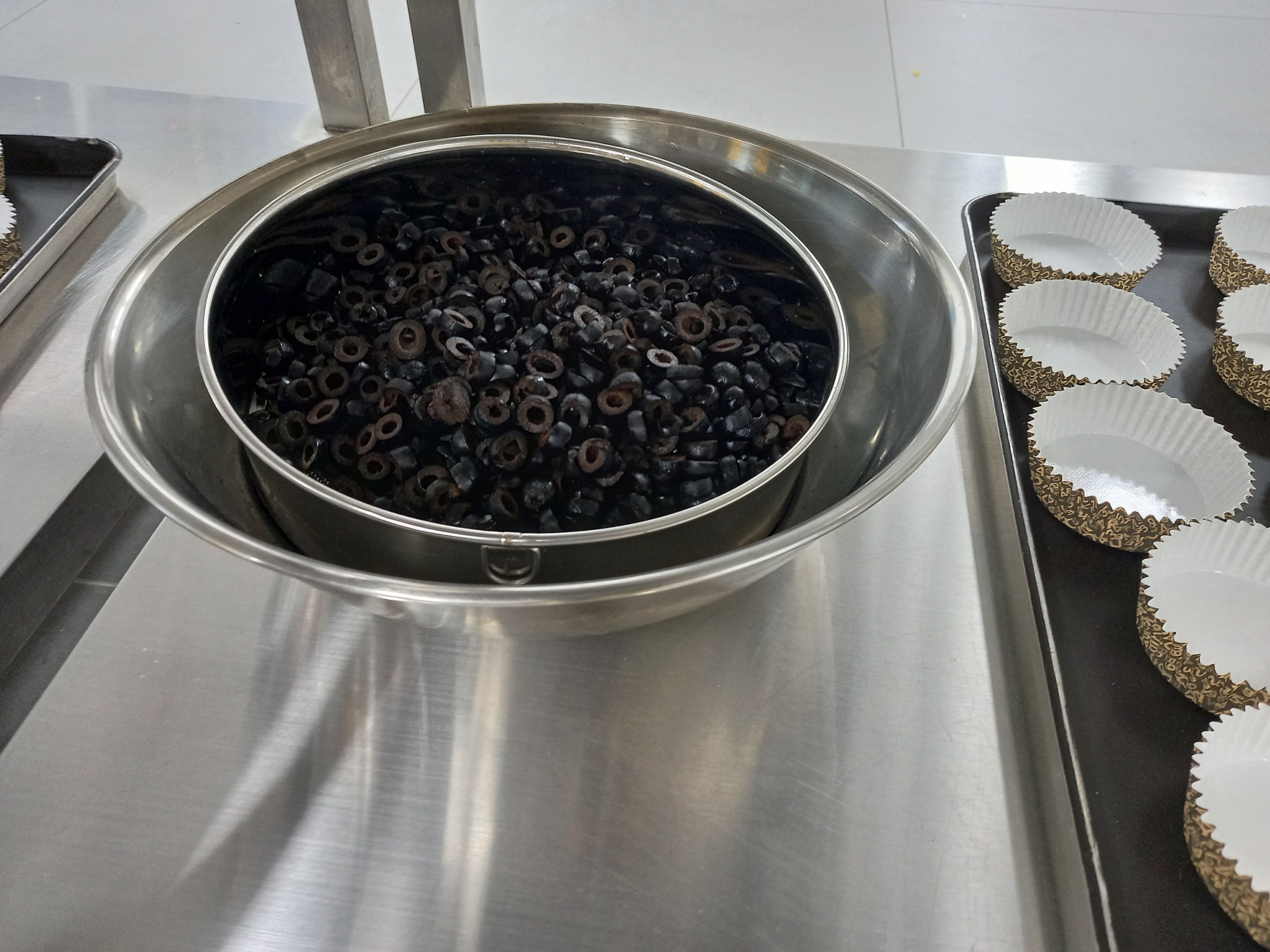 올리브와 옥수수 통조림을 까고 통조림을 세척해서 상자에 넣었습니다. 또 종이로 된 머핀컵을 준비해서 팬에 가지런히 놓았습니다.