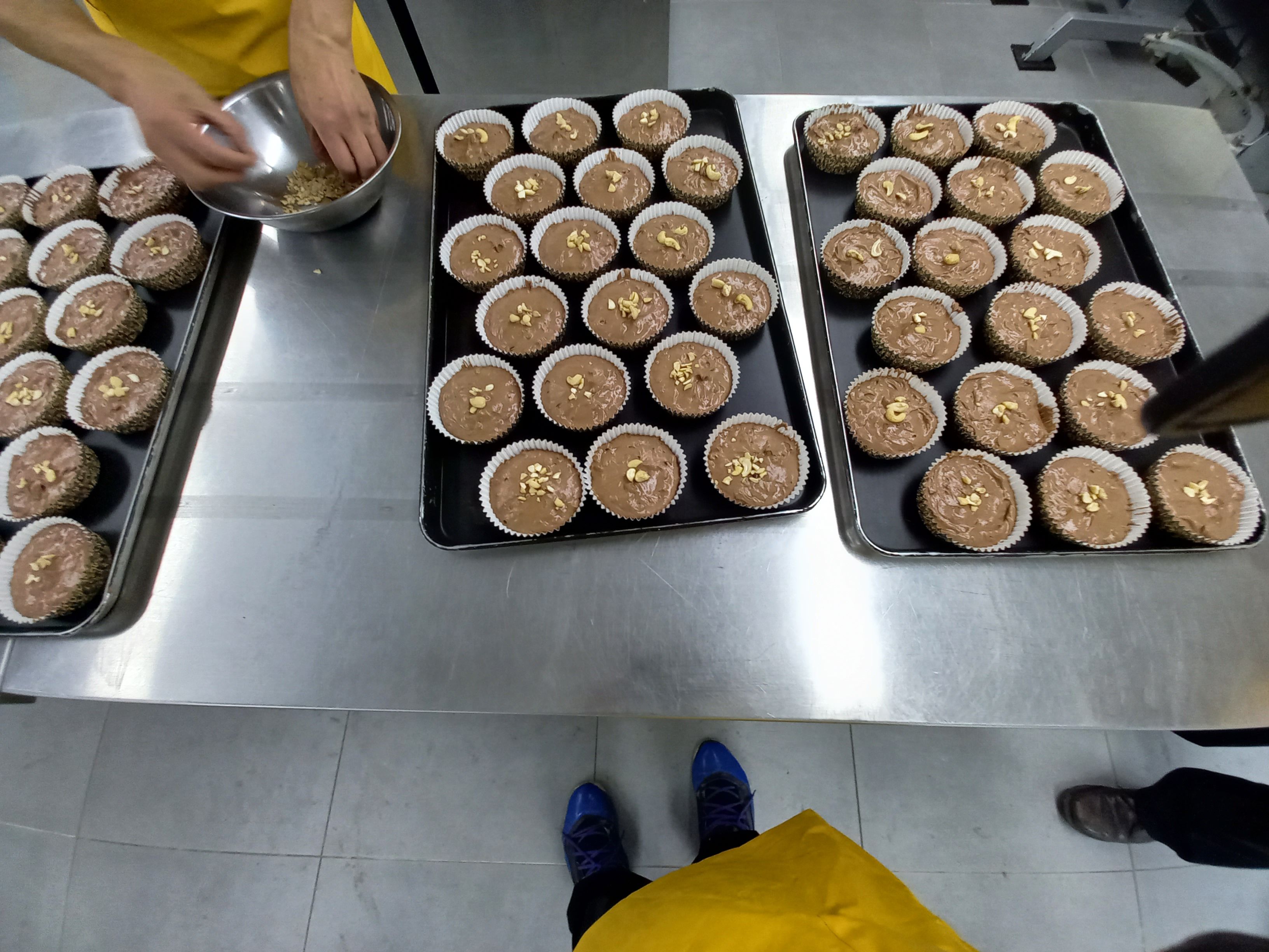 머핀컵에 초코머핀 반죽을 정해진 양만큼 넣고 순가락으로 평평하게 정리한 뒤, 중앙에 너트를 넣고 오븐으로 들어갔습니다.