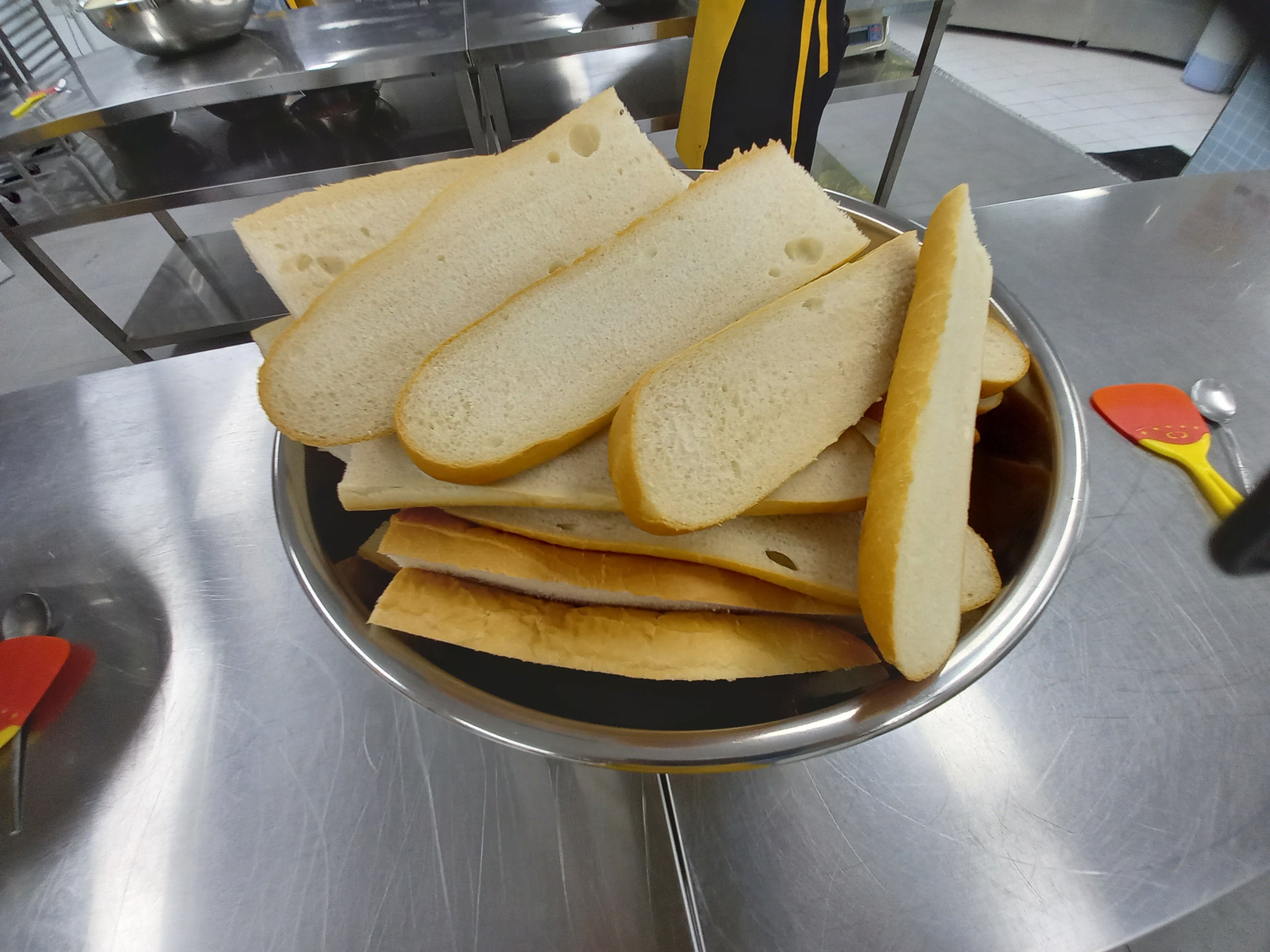 바게트 빵도 4등분해주었습니다. 빵의 길이가 55cm ~ 57cm로 긴 편이었는데 이를 자로 잰 뒤 반으로 나누었습니다. 또다시 반으로 자르는 일은 제빵사 선생님께서 직접 하셨습니다.