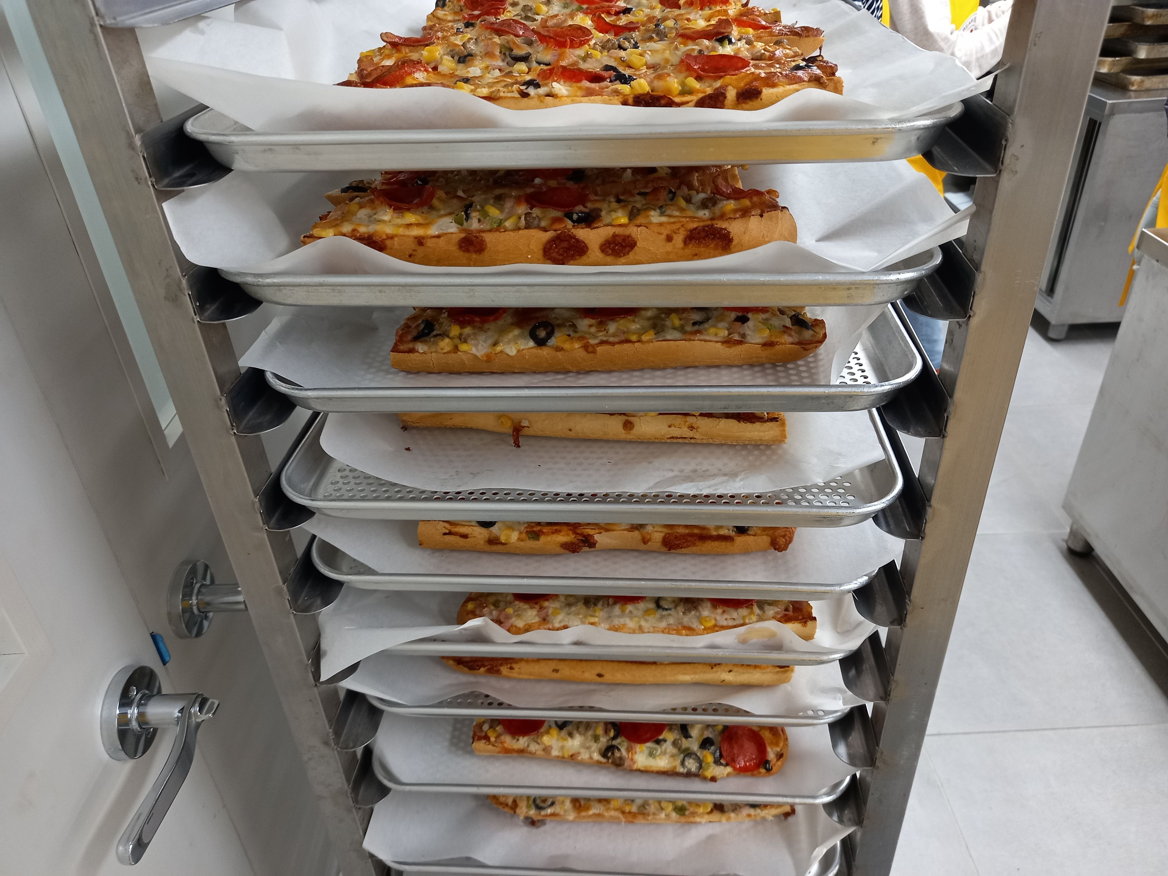 휴식이 끝나고 빵을 포장지에 넣었습니다. 바게트 피자 빵은 크기에 딱 맞게 두꺼운 종이를 살짝 조립해서 안에 끼워주고 긴 포장지에 넣었습니다. 바닥청소 등 뒷정리도 미리 해주었습니다.